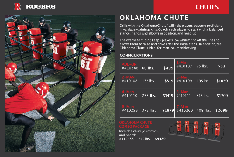 Drills with the Oklahoma Chute™ will help players become proficient in yardage gaining skills. Coach each player to star with a balanced stance, hands and elbows in positiion and head up.